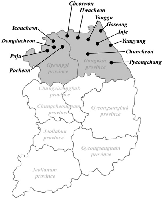 Map of Paju City, Yeoncheon County, and Pocheon City near the DMZ